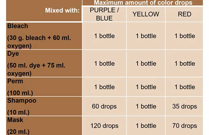 Εάν χρησιμοποιείται ως διορθωτικό χρώματος (ΜΠΛΕ & ΜΩΒ ΣΤΑΓΟΝΕΣ), προσθέστε 1 με 10 σταγόνες. Εάν χρησιμοποιούνται ως ενισχυτές (ΜΠΛΕ, ΜΩΒ ΚΙΤΡΙΝΕΣ & ΚΟΚΚΙΝΕΣ ΣΤΑΓΟΝΕΣ), ανάλογα με τον επιλεγμένο στόχο, μην υπερβαίνετε τη μέγιστη ποσότητα που αναφέρεται στον πίνακα*.